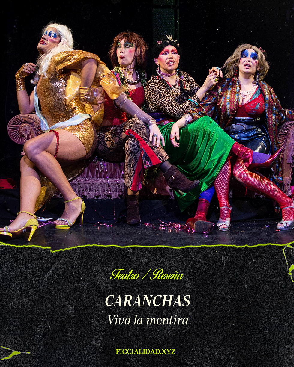 Caranchas es una comedia grotesca, excesiva y travesti que rescata el humor negro y el delirio de Urdapilleta. Con recursos audiovisuales, coreografías del caos y actuaciones estrafalarias, nos metemos en un mundo en el que la diferencia de clases está bien definida. La obra se ríe de esas mujeres de clase alta que lo único que tienen es su soledad. Es, también, un diálogo con una Argentina que repite su historia una y otra vez.